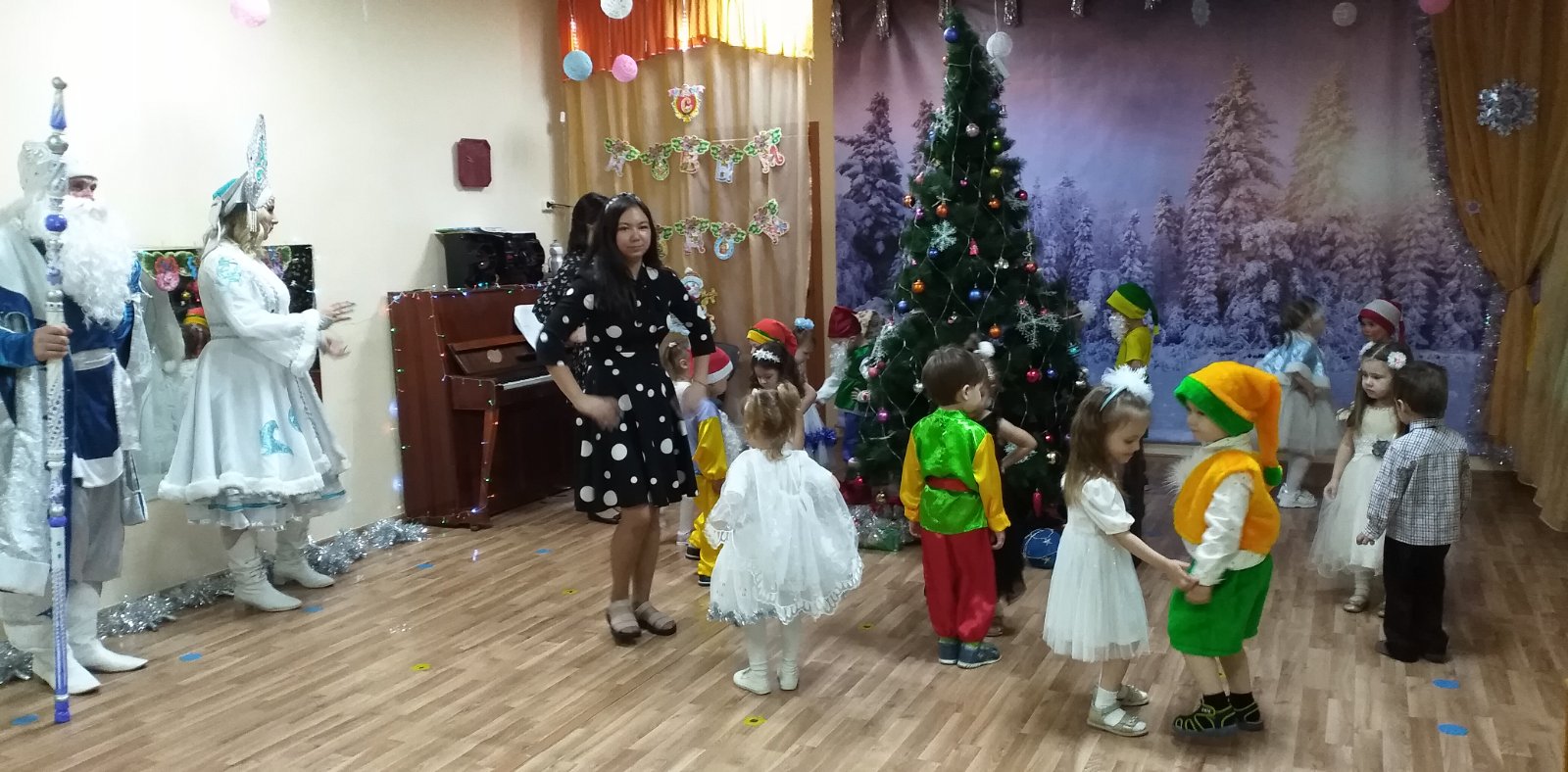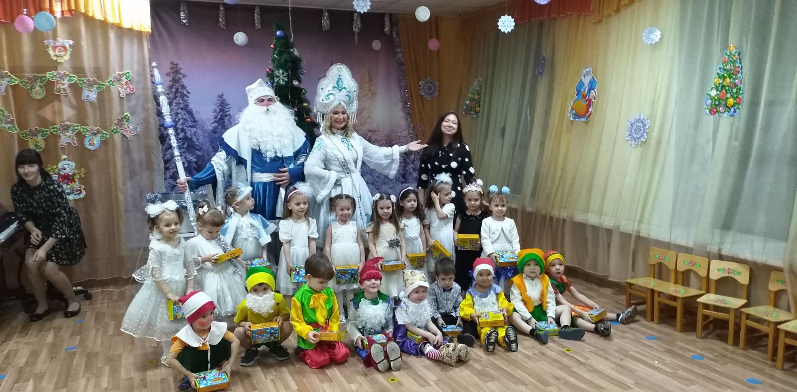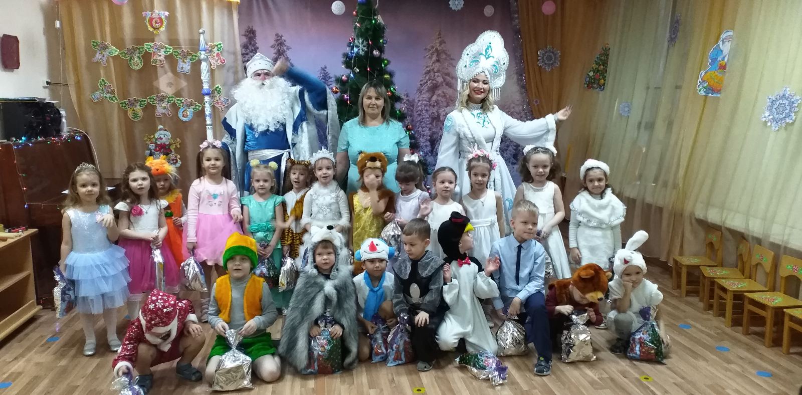 Каждый год в конце декабря для воспитанников всех возрастных групп в нашем детском саду организуются праздничные новогодние утренники. Красиво украшенный зал, нарядная елка, великолепные костюмы, подарки, Дед Мороз, Снегурочка и множество других сказочных персонажей ожидали наших воспитанников.